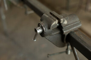 This metal tool that attaches to a table is a vise. It allowed a piece of wood or metal to be held firmly while being worked. It was an essential tool in woodworking and DIY workshops.