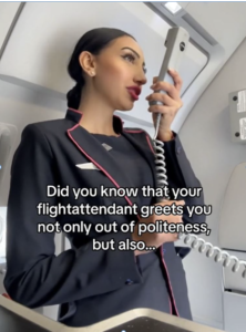 The cabin crew has an astonishing to-do, consisting of more than more people realize. Their perky greeting to every passenger is no exception.