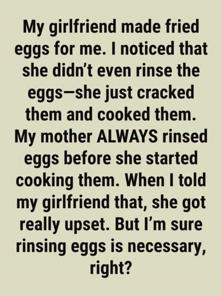 Once things settled, Evan apologized. He explained that rinsing eggs wasn’t a must, just a habit he picked up from his mom, something that felt familiar and safe.