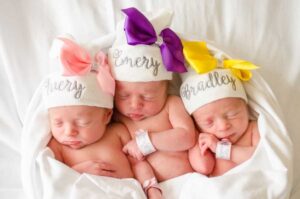 I feared going in for that scan. My husband was quiet. I went back into the scan alone with a tech I was close too. I told her about the bleeding, but she said they would see what’s going on. As soon as the scan started, my tech said things ‘look good,’ ‘really good,’ – ‘too good.’ She was unable to tell me anything more, but told me I was okay to relax. I laid there for 20 minutes while she took hundreds of pictures. I assumed it was normal. At the end she said she was going to take pictures for me then she said, ‘Let’s see if I can get THEM to smile.’ I replayed her words in my head over and over again with a huge smile on my face. As soon as she exited the room, I ran to my phone to text my husband that we were having TWINS! We were so giddy in the waiting room waiting to go back. We didn’t officially know anything though, so we were trying to hide our excitement. Our doctor finally approached us with the news. She started talking like we already knew the final results when she said, ‘Not twins… triplets!’ She appeared to be mad that the frozen embryo transfer worked x3. She went over all the things that could go wrong, but all I heard was that I was having triplets.