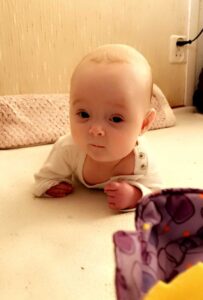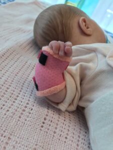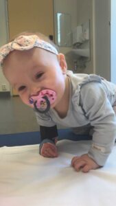 In Mia’s case, that means she is completely healthy except for missing two bones that didn’t completely form when she was in the belly. She is missing the radius bone in her right arm. To explain it simply, you have two bones in your arm. One that’s on your little finger side, and one that’s on your thumb side. Mia is missing the one that is on the thumb side – that’s why she is missing a thumb and her hand is staying in 90 degrees instead of straight.