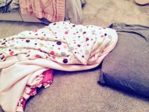 There was nothing I could do. She’d taken some medicine for a cold, so I couldn’t give her anything else. She knew all the mental games and relaxation tricks. She’d already tried doing something else. So, I offered the only thing I could: my presence. I made up a bed on her cushiony carpeted floor, told her I’d stay there in case she thought of anything else I could do, and we both went to sleep.