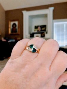 It was a dark and stormy night… and Manny (the dude I am married to now) were making our monthly Costco run. We walked by the jewelry section and I spotted the most unusual, prettiest emerald ring. We’d been talking marriage but that’s it, we just talked about it. As we paused Manny said, ‘nice stuff’. I said, ‘yes the emerald is gorgeous.’ Manny was non-committal. About that time one of the Costco employees meandered over and asked us if they could answer any questions we might have.