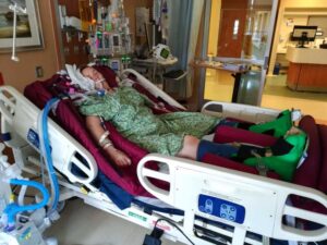 After a couple days on the high-flow oxygen, I had started waking up more and was beginning to comprehend everything. But the air flow had become so overstimulating, I began breathing through my mouth, and started suffocating. I coded as my blood oxygen levels tanked. Quickly, I was re-sedated, re-intubated, and the decision was made to give me a tracheotomy. This procedure would allow the high-flow oxygen to flow directly into my windpipe, bypassing my nose and mouth.