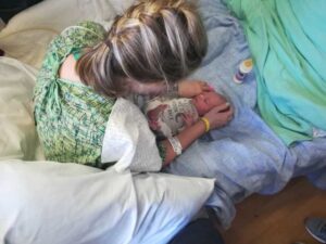 My lungs still had a lot of healing to do, but I didn’t need to be intubated or sedated once the trach was in. I began weaning off the heavy sedatives and pain killers (which caused all the crazy paranoia, nausea, shaking, muscle paralysis, and other side effects), and was able to learn about my baby. I was devastated I had missed those precious moments after birth during which we would have bonded. I was heartbroken I wouldn’t be able to nurse him. I wept and begged the doctors silently, ‘Please downgrade me out of the Intensive Care Unit so I can finally meet my baby!’ (Kids weren’t allowed in the ICU.)