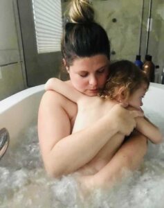 Finally, when she came in again, I told him just put her in the tub with me. She immediately stepped in, hugged me, and clung to me. Intermittently she would turn to give me a kiss and say, ‘Hi Mama,’ and then we sat in silence holding one another, her head on my chest listening to my heartbeat, while I patted her back and smelled her sweet curls. We stayed that way for about 45 minutes, skin to skin in the warm water, just being present for one another. It was precisely what each of us needed.