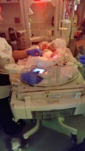 Newborn lays in NICU with nurses monitoring him