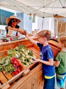 ‘Come on guys, we need peppers, here are some beautiful ones! Let’s count together, 1…2…3…4…’ ‘Okay, so if it was $4.67 and you gave her $5 how much change should you get back.’ The youngest was already biting into a yellow pepper like an apple.