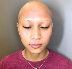 I don’t have bad days anymore, and I have completely embraced and fallen in love with my bald head. I love being able to share my story and experiences with others because I remember how lonely and heart-breaking it was to go through the hair loss experience. I want to show others dealing with hair loss that your hair does not define your beauty: you can still live your best life! This year in January, I married Nick, and showcased my bald head with no veil or hair accessories. I was so proud to be a bald, beautiful bride!”