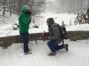 My now husband surprised me in Central Park. In a BLIZZARD. The entire city was shut down, there were 7 people in Times Square and no one was allowed on the roads after 2 p.m.