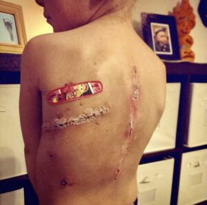 Treatment was brutal. Seventeen rounds of chemotherapy over the course of a year. Multiple surgeries, including the removal of four ribs, part of her spinal sheath, and a spinal fusion.