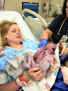 We walked across town and we could see the park when I felt a pop. I looked at Nikki and said, ‘I think my water just broke.’ She was shocked. I was shocked. I called my husband 4 times before he answered. I told him, ‘My water broke and we’re heading home to pack a bag.’ He was up in a lift and I remember hearing him yell, ‘Let me down. I gotta go. My wife’s having her baby.’ Nikki watched my kids and dropped me off at the hospital and Kyler made it there shortly after.