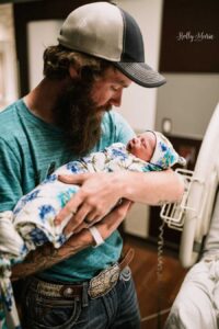 The night before I was to be induced, Kyler had welded all day long and then headed home around 9 p.m. He was in Illinois, so he was driving all night. We had to be checked in at 6 a.m. He drove as fast as he could and made it home with just over an hour to spare. He took a shower and tried to nap a little before we had to go. We got checked in and things were moving slowly. Around 1, he was starving. I kept begging him to go to the cafeteria and grab some food; he really needed it. He refused to go eat until she was born and I’m glad he waited because she showed up a short ten minutes after that conversation. Those words I’ll never forget, ‘I just drove all night. I’ll be damned if I’m eating and miss her birth.’