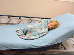 “I’m sitting here beside my two-year old’s hospital gurney. He looks so tiny curled up sleeping in a bed that was meant to hold an adult.