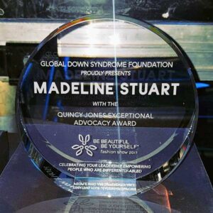 Since then, Madeline has been not stop and has achieved some of the most incredible milestones in her career, personal life, and for society. Her fashion achievements are astounding. She has walked in over 103 Fashion Shows worldwide since the beginning of her career. Most of them on the major professional fashion circuits around the world. She has walked the last 7 seasons of New York Fashion Week. She was the first model with Down syndrome to walk at London Fashion Week, Paris Fashion Week, Mercedes Benz Fashion Week China, Runway Dubai, Qatar, and many more.