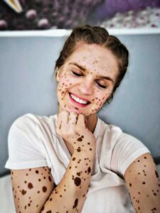 Up until school, I never felt odd or different. I grew up happy and safe, surrounded by loving and supporting parents, family and friends. Sometimes other children or adults would ask about my skin but only because they were very curious and have never seen anything like it before. Nothing that would make me feel bad or uncomfortable. Even though I never really knew why my skin was sprinkled with thousands of tiny and larger brown dots, I just accepted having them. They were a part of me and I never really thought about them. Nobody really judged. Including me.