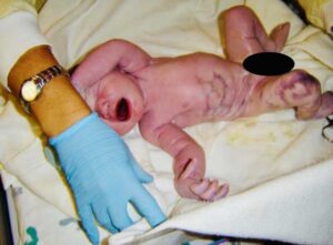 The next few hours were sort of a blur but, eventually, I was able to see my beautiful 8 lb. 5 oz. baby in the NICU. The nurses were all loving on this giant baby as they are normally holding preemies! The attending physician in the NICU had been working at our hospital for over 30 years and had no idea what was going on with our baby’s skin which was purple/black marbled on the right side of his abdomen and down his whole right leg. She took photos and sent them to the attending dermatologist who diagnosed our Adam with Cutis Marmorata Telangiectatica Congenita (CMTC). I’m sorry… WHAT?