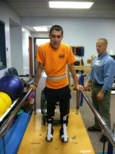 Each week we set goals and each week I crushed those goals! When a therapist can see the patient’s drive, they in return feed off of your energy and go that extra step. I was in outpatient rehab for 2.5 years, and my MAIN goal was to walk in braces, something doctors said to be impossible. The therapists knew this goal and knew that we were going to reach it one way or another. We began standing in the standing frame daily, I started out only being able to tolerate 5 minutes I would start to get dizzy. I kept getting denied by insurance to get KAFO (knee-ankle-foot orthotic) braces because it was not practical for a high-level injury like myself to use this type of brace. My Physical Therapist and Occupational Therapist brainstormed and came up with an idea. They got a pair of knee immobilizer braces and some ace bandages to keep my toes pointed up, and we started working on standing/trying to take a step.
