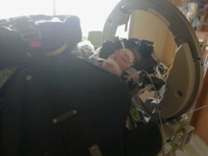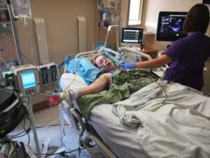 After a couple days on the high-flow oxygen, I had started waking up more and was beginning to comprehend everything. But the air flow had become so overstimulating, I began breathing through my mouth, and started suffocating. I coded as my blood oxygen levels tanked. Quickly, I was re-sedated, re-intubated, and the decision was made to give me a tracheotomy. This procedure would allow the high-flow oxygen to flow directly into my windpipe, bypassing my nose and mouth.