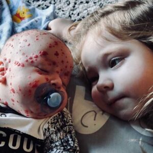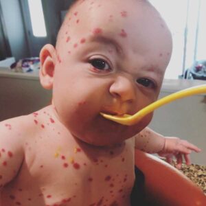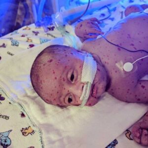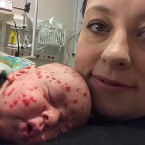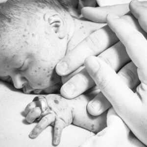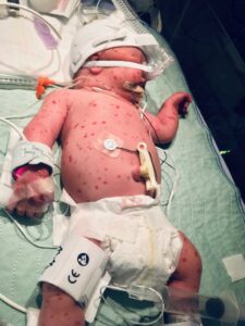 My son was delivered by emergency c-section. The first glimpse I had of him, I noticed he was blue, and his skin was covered with deep purple spots. He wasn’t crying. The whole room was especially quiet. I thought the worst, my heart dropped, but then – he let out the weakest cry. Thank God, he was breathing.
