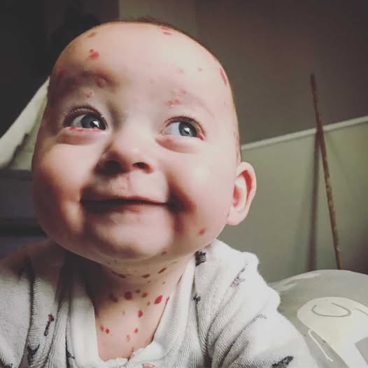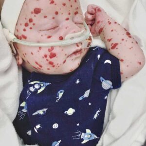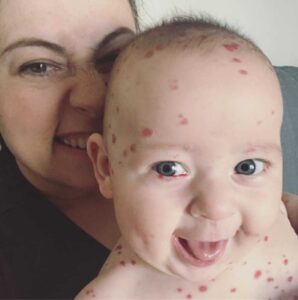 Dominic was out of acute danger but he needed time to heal his body. We had biopsies on his skin and found that his spots are just benign birthmarks – yet so many more than any of our doctors had seen before. The amount of birthmarks was shocking and the dermatologist was involved daily to make sure her diagnosis was correct. There was a possibility of it being an ever rarer condition, but a skin biopsy confirmed they were just birthmarks. We reached out to specialists across the world and none of them had seen a case like Dominic’s. He had many issues with the birthmarks; he would bleed from several of them daily and required transfusions. We also found out he had a brand new genetic mutation. He may be the only one in the world that has this mutation.