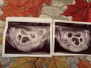 I went in the following week for an early ultrasound because I was at high risk for ectopic pregnancy because of my left side being blocked. We had a resident doctor doing the ultrasound. She said everything looked good, but something seemed off. She said it looked like I had ovulated from the left side. ‘That’s impossible,’ I thought to myself. When my fertility specialist came into the room, the first thing she said when she looked at the screen was, ‘I see twins!’