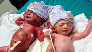 At 31 weeks, my girls were delivered. Both were tiny, one very pale and thin, the other red, puffy. Both were dangerously ill, but thanks to the team at the hospital, they were well looked after. My anemic twin had 2 blood transfusions, and my twin that had too much blood had blood taken from her, and her blood thinned out. They were critically ill for a few weeks.