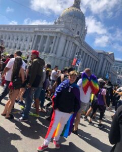 Since we have no ‘coming out day,’ we were excited to celebrate Pride for the first time at the largest Pride Parade in San Francisco. I don’t think Brooklyn really knew what the day meant, or that they even had a day to celebrate love and the LGBTQ community. I’m pretty sure she googled it. In fact, she was more worried about refusing to wear rainbow because all she wears is black. The day before, we went shopping as a family to purchase our outfits. In true Brooklyn fashion, she found the perfect rainbow shirt, although she was still hesitant about wearing it. She didn’t exude any particular excitement. I mean she smiled, but I think she was more nervous about the day because it was something she had never done. She barely called herself gay or used the words ‘I’m gay’ out loud, so going to a festival meant essentially having to shout it from the rooftops.