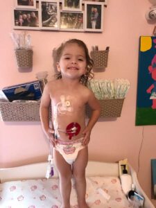 Nataleah is now a 29 pound 3-year-old. She has made leaps and bounds in her development. She is active and so much healthier. She is full of life, laughter and love. She has a spirit that I have never seen in a child. I try to let her live as normal a life as any other toddler. She’s in preschool, loves riding the school bus and has even tried soccer. She is everything that excites her. Nataleah also lives in chronic pain every single day. The intestinal dysmotility as a result of a nerve injury in her small intestine has caused quite the turmoil in her little body. Every day she complains that her belly hurts. Every day she retches and throws up. This has become our normal.