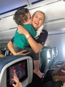 “I don’t know her name, but she was our hero on our flight home. My son Xayvior has a lot of anxieties and due to his special needs and recently diagnosed autism he responds suddenly with change.