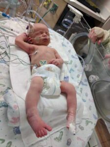 By some miracle, my husband made it to the hospital minutes before our son was loaded into the helicopter and they made the room so I could ride in it as well. My husband and in-laws went back to our house and loaded up some clothes and necessities before making the drive down to the hospital to meet me. That helicopter ride was nothing short of torture. I was so grateful not to leave our son but every beep and noise that came from his little incubator sent my stomach spiraling. Sitting in the NICU helplessly praying you don’t have to say goodbye to your child is the lowest I have ever felt. My husband and I spent the longest 5 days at that hospital with our many family members, who came to support, and our little fighter pulled through after tons of tests, four transfusions, and lots of questions. We are still trying to get answers as to why what happened happened. We know that by some miracle our son was saved just in time.