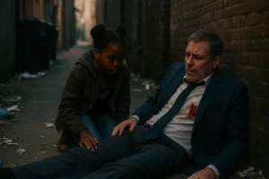 Crumpled against a dumpster, one leg bent strangely beneath him, was an older gentleman in a navy-blue suit. His white shirt was splashed with what looked like blood, and his hand trembled as he reached toward something invisible.