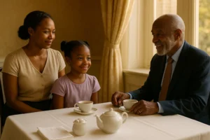 Tasha wore her best—an old lavender dress borrowed from a neighbor—and clutched her mother’s hand like it was a lifeline. The butler led them through a marble hallway into a sunlit room with tall windows and crisp white napkins.