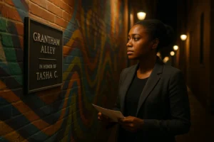 Ten years later, Tasha stood in the same alley, now renovated and lined with murals.