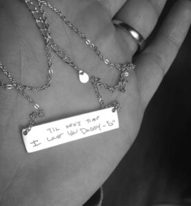 Since getting the tattoo, I also had a necklace made from something he wrote in a journal he kept in his last days. There’s just something about keeping such a specific piece of him so close that is so comforting. I’ve worn it for almost two years straight now, never taking it off.